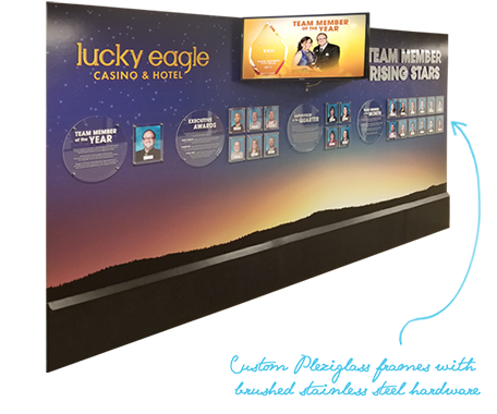 Turn ordinary walls into another world with floor-to-ceiling custom displays that are both informational and inspirational. Welcome your visitors with a one-of-a-kind first impression into an immersive environment that will set the tone and say who you are in a big way.